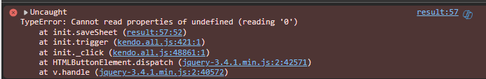 As you can see the initialization of the spreadSheet, dataSource and button in this example is pretty bare bones... I only like to initialize kendo ui widgets/components with the bare minimum I have to. So. there are options missing. My full example code is located here: