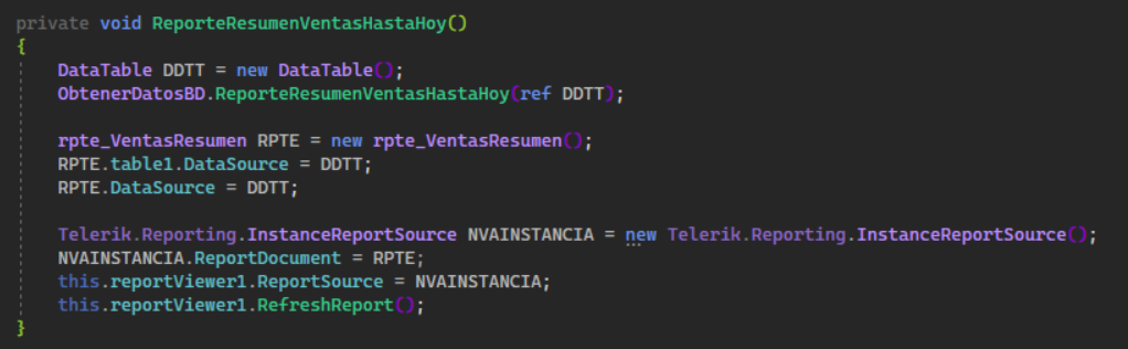 Imagen 05 - En esta imagen se ve el codigo que utlizo para pasar datos al reportviewer y a la tabla.