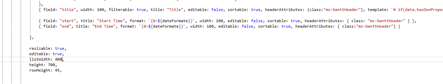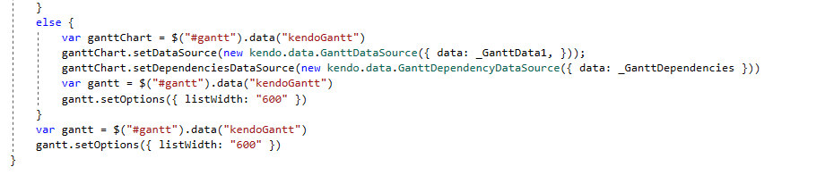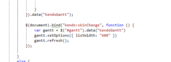 if (e.item.innerText == "Gantt Chart") { var gantt = $("#gantt").data("kendoGantt"); gantt.resize(); gantt.setOptions({ listWidth: "500" }) gantt.refresh();