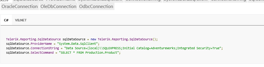 This code snippet configures an SQL data source instance. Such code is usually found in programmatic report definitions created with the Visual Studio Report Designer and, often, in custom ReportSource resolvers that modify reports at runtime.