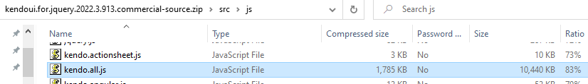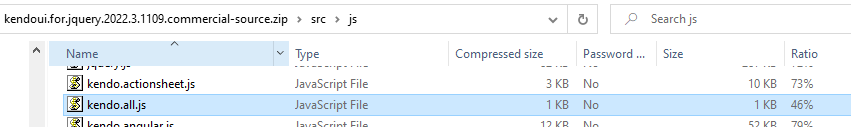 I am looking for kendo.all.js, not kendo.all.min.js. This file is part of the source code area below where you are looking. You can see the sizes have changed dramatically: