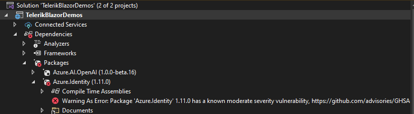 The Microsoft packages reference 8.0.0 instead of the latest. Azure.Identity is referencing 1.11 and for some reason Visual Studio is refusing to load it. It's showing a moderate vulnerability so I upgraded to 1.12. It makes feel the demos haven't been upgraded in months.