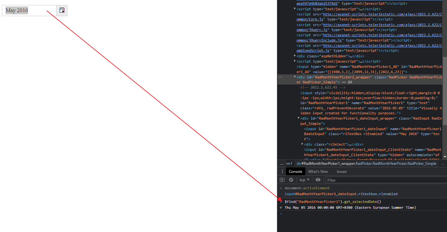 <telerik:RadMonthYearPicker ID="RadMonthYearPicker1" runat="server" SelectedDate="2016/5/5 12:00"> <DateInput runat="server" ></DateInput> </telerik:RadMonthYearPicker> <asp:Button Text="Get Date" OnClick="Unnamed_Click" runat="server" /> <asp:TextBox runat="server" ID="DateValue"/>protected void Unnamed_Click(object sender, EventArgs e) { DateValue.Text = RadMonthYearPicker1.SelectedDate; }Can you share the declaration of the control on your side? It could be something date input formatting or even Culture related - see https://docs.telerik.com/devtools/aspnet-ajax/controls/monthyearpicker/functionality/formatting-values?