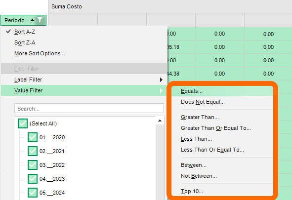 But I cannot reach the other values, for example if I use "Equals", I would also like to obtain the name of the field that is used to perform that condition and so on for the other options of "Value Filter", that field is the one that is you can select in the window that is displayed when the filter is applied: