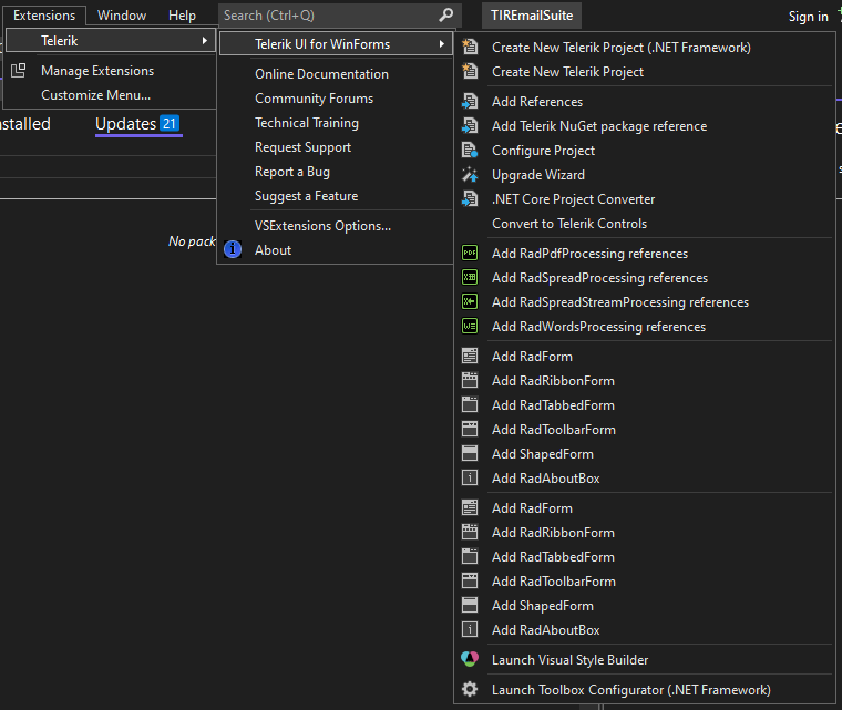 I'm running into a peculiar issue with VS Community v17.0.4 2019 and the Telerik Extension. When I attempt to launch the Upgrade Wizard (or most of the other options):