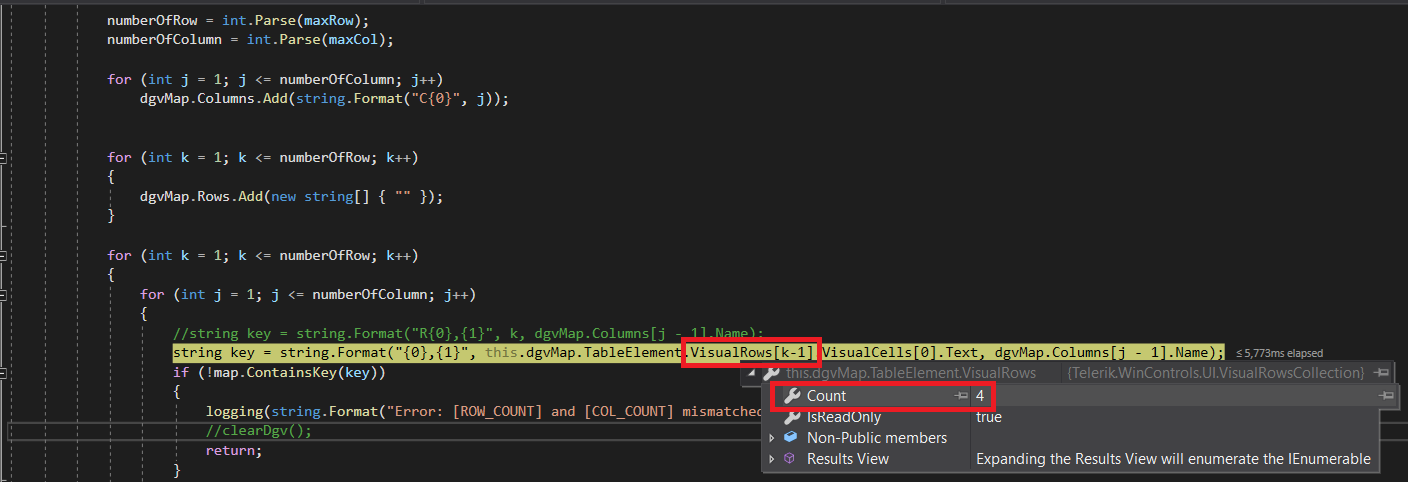 string key = string.Format("{0},{1}", this.dgvMap.TableElement.VisualRows[k-1].VisualCells[0].Text, dgvMap.Columns[j - 1].Name);