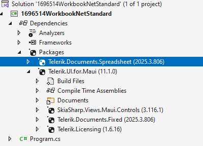 The Telerik.Documents.Spreadsheet NuGet packages should be installed in your project to recognize the Workbook. The illustrated Telerik.UI.for.Maui NuGet package doesn't contain the required package. Only Telerik.Documents.Fixed is included out-of-the-box: