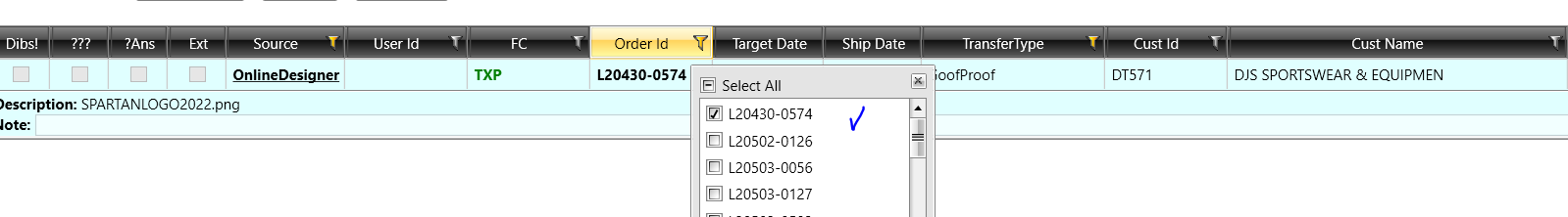My grid is filtered and it works for all the columns (Just in case it wasn’t clear, the grid is indeed filtered by Source and Order Id). For all the fields that are strings, the filters look good when it shows: