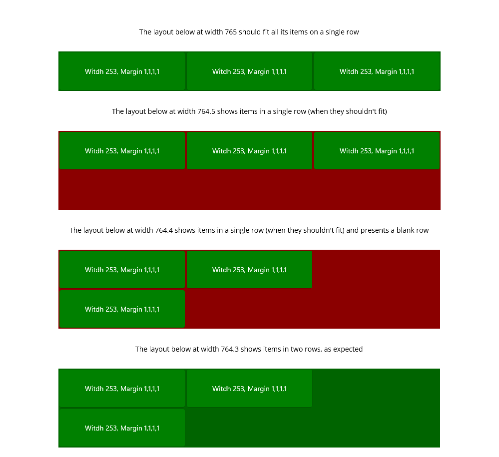 <Label Margin="30" HorizontalOptions="Center" Text="The layout below at width 764.4 shows items in a single row (when they shouldn't fit) and presents a blank row" />