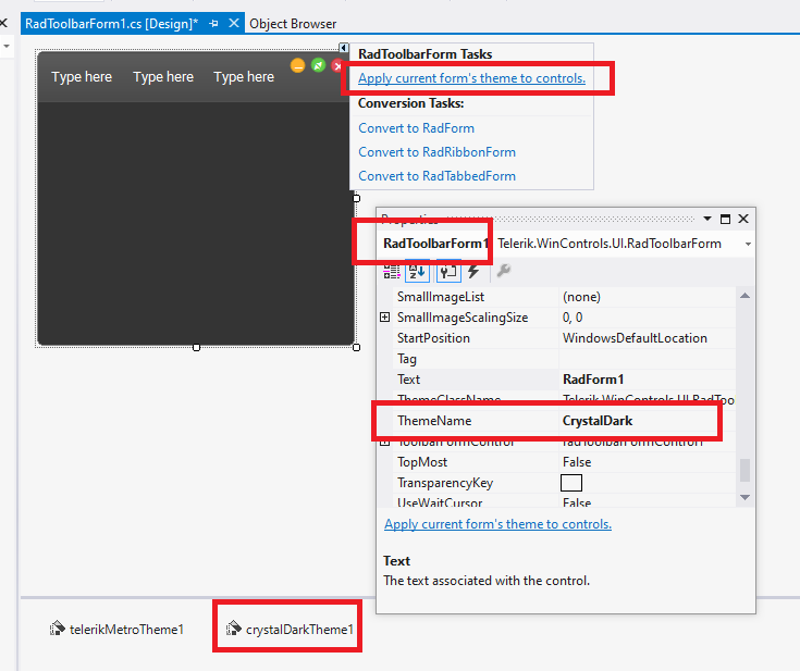 If you have installed the Telerik UI for WinForms suite from the provided installation files, you will see the themes loaded in the Visual Studio toolbox. In order to use the Theme components, just drag and drop them from the VS Toolbox to the form. This will add a reference to the corresponding theme assembly in the project and will enable the theme in the ThemeName drop-down of all Telerik controls on the form. All you have to do afterwards is to set the needed theme from the ThemeName drop-down (in the smart tag) or programmatically.