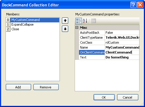 The DockCommand Collection Editor lets you add commands to a RadDock control. The commands you add here appear on the title bar of the control. To display the DockCommand Collection Editor, click on the ellipsis button for the Commands property of the RadDock control.
