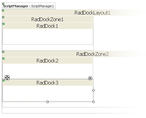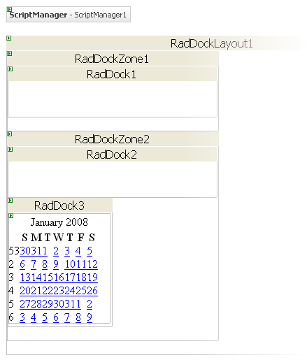 Drag a RadDockLayout component from the toolbox onto your Web page. The RadDockLayout component is responsible for ensuring that the layout of the RadDock controls on your page is maintained after any postbacks. This happens automatically, as long as the RadDock and RadDockZone controls are created inside the RadDockLayout control.