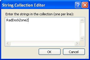 Click the ellipsis button on the ForbiddenZones property to bring up the String Collection Editor. In the String Collection Editor, add a single string, "RadDockZone2". The ForbiddenZones collection holds the UniqueName properties of all dock zones where the RadDock control can't be docked. By adding "RadDockZone2" to this collection, you ensure that the RadDock control can't be docked in the second dock zone. Because its DockMode property is "Docked", this means that the only place the RadDock control can reside is docked in the remaining dock zone, RadDockZone1.