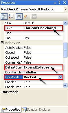 - the DockMode property to "Docked". This restricts the RadDock control so that it must be docked in a dock zone.