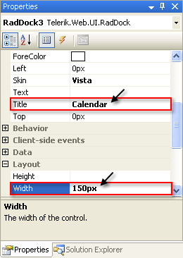 In the properties pane for this RadDock control, set the Title property to "Calendar" and the Height property to "150px":