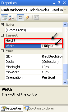 In the properties pane for the RadDockZone control, set the Height property to an empty string and the width property to "150px":