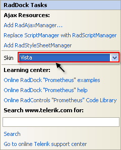Using the Smart Tag that appears automatically when you place the RadDock control, set its Skin to "Vista".