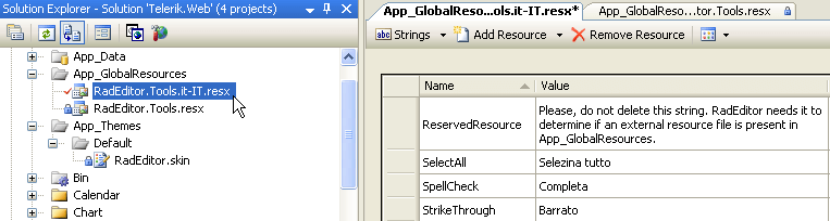 After renaming the files, localize the strings in the Value column of your new resx files. Then set the Language property of RadEditor to the name of the <localization> string in the RadEditor.Tools.<Language>.resx file: