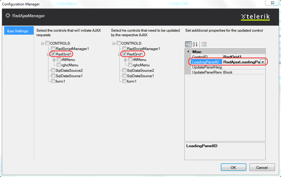 Check the check box for the RadGrid control in the panel for controls that need to be updated by the respective AJAX requests.