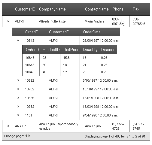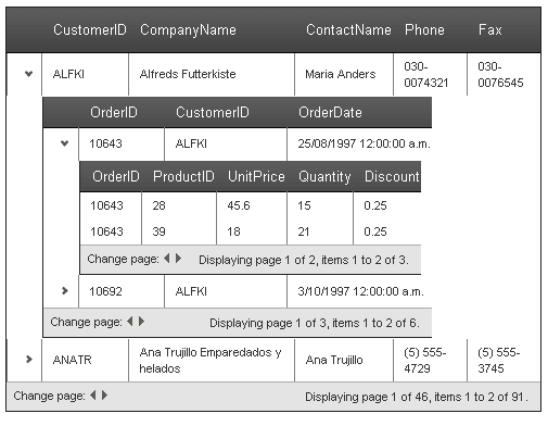 The third example shows a RadGrid control that enables paging with a PageSize set to 2, but with a detail table that overrides this setting.