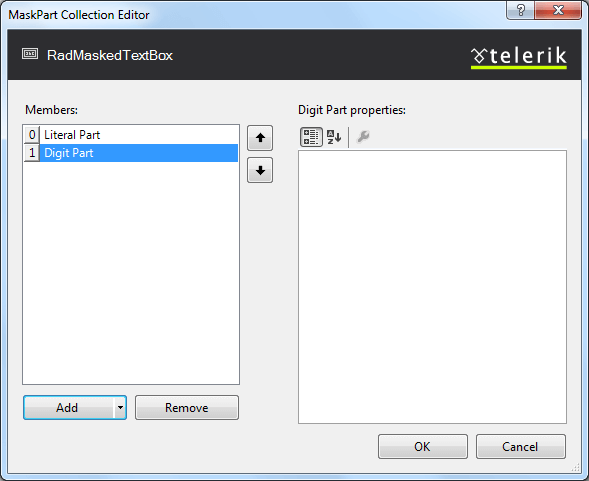 The MaskPart Collection Editor lets you create and modify the masks that are the values of the RadMaskedTextBox control's Mask and DisplayMask properties. You can display the MaskPart Collection Editor in two ways: