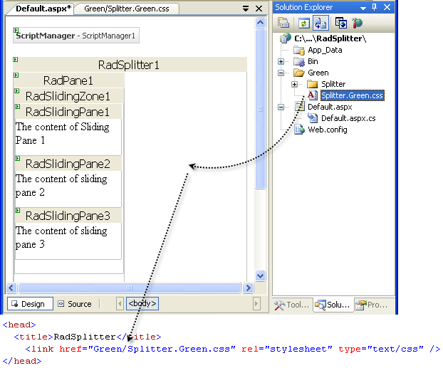 Drag the "Splitter.Green.Css" file from the Solution Explorer onto your Web page. This automatically adds a reference to the page "<head>" tag as a "<link>" to the new stylesheet: