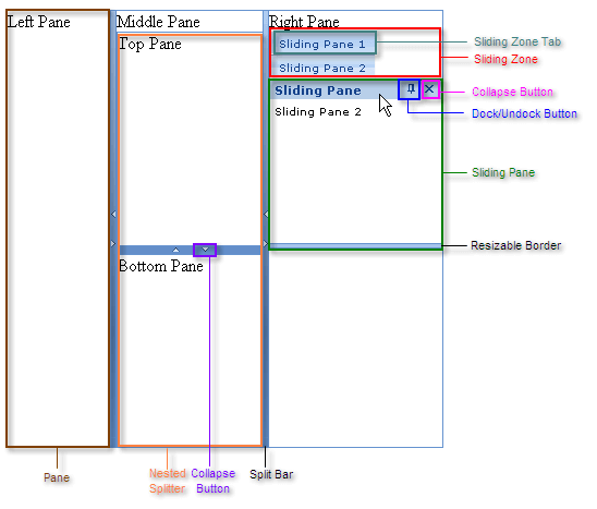 Sliding zones, which are implemented by the RadSlidingZone control, hold panes (called sliding panes) that slide in and out, like the user interface of Visual Studio. RadSlidingZone must be placed inside a RadPane control.