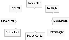 Position: defines the relative location where the ToolTip will appear and can be one of the following values: BottomCenter, BottomLeft, BottomRight, Center, MiddleLeft, MiddleRight, TopCenter, TopLeft, TopRight. Notice in the screenshot below that the callout points in relation to the tooltip position.