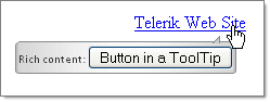 ASP.NET<telerik:RadToolTip RenderMode="Lightweight" ID="RadToolTip1" Skin="Inox" runat="server" TargetControlID="HyperLink1"> Rich content: <asp:Button ID="btnA" runat="server" Text="Button in a ToolTip" /> </telerik:RadToolTip>C#RadToolTip1.Controls.Add(new LiteralControl("Rich content:")); Button button = new Button(); button.ID = "btnA"; button.Text = "Button in a ToolTip"; RadToolTip1.Controls.Add(button);VBRadToolTip1.Controls.Add(New LiteralControl("Rich content:")) Dim button As New Button() button.ID = "btnA" button.Text = "Button in a ToolTip" RadToolTip1.Controls.Add(button)You can also add large amounts of content dynamically using the RadToolTipManager OnAjaxUpdate event.