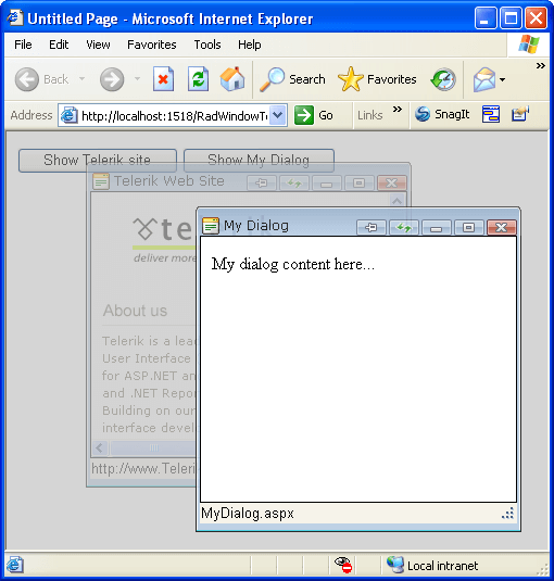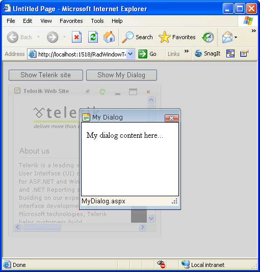 Press F5 to run the application. Click both buttons to bring up both windows. They both get the "Vista" look from the RadWindowManager skin. Note the differences in behavior. The "Telerik Web Site" window gets its title from the RadWindow control, while "My Dialog" gets its title from the HTML markup of MyDialog.aspx. The "Telerik Web Site" window is not modal, while "My Dialog" is modal.