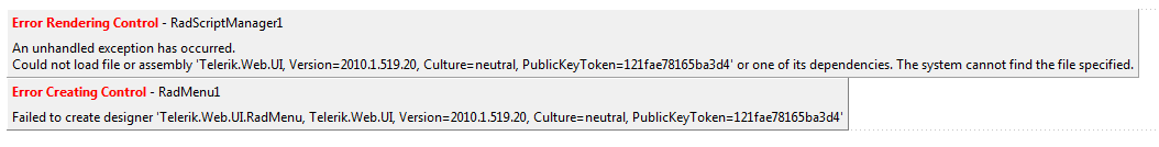 Telerik.Web.Design.dllfrom the GAC. This will fail if you have installed ASP.NET AJAX controls with the installer. -