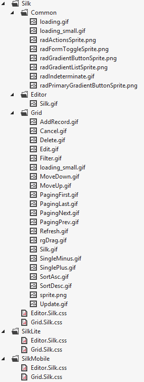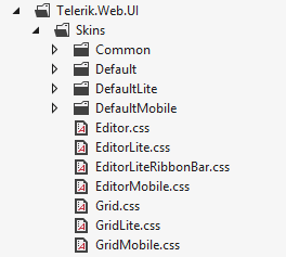 Figure 2 and Figure 3 show the basic file structure and location of a skin with its Render Mode-specific variations. For brevity, only files related to RadGrid and RadEditor are shown. A full-blown skin will contain the full control list according to the supported render modes. Figure 3 shows a collapsed structure of the Default skin and its Render Mode variations as well.